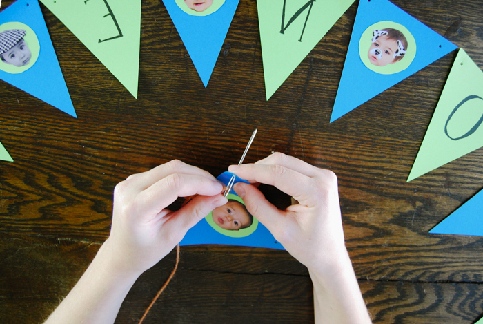 Cut off about an arm spans of twine and string the triangles so that the twine goes front to back into the right-hand hole, and back to front on the left. I kind of cheated and used my knitting needle for assistance.
